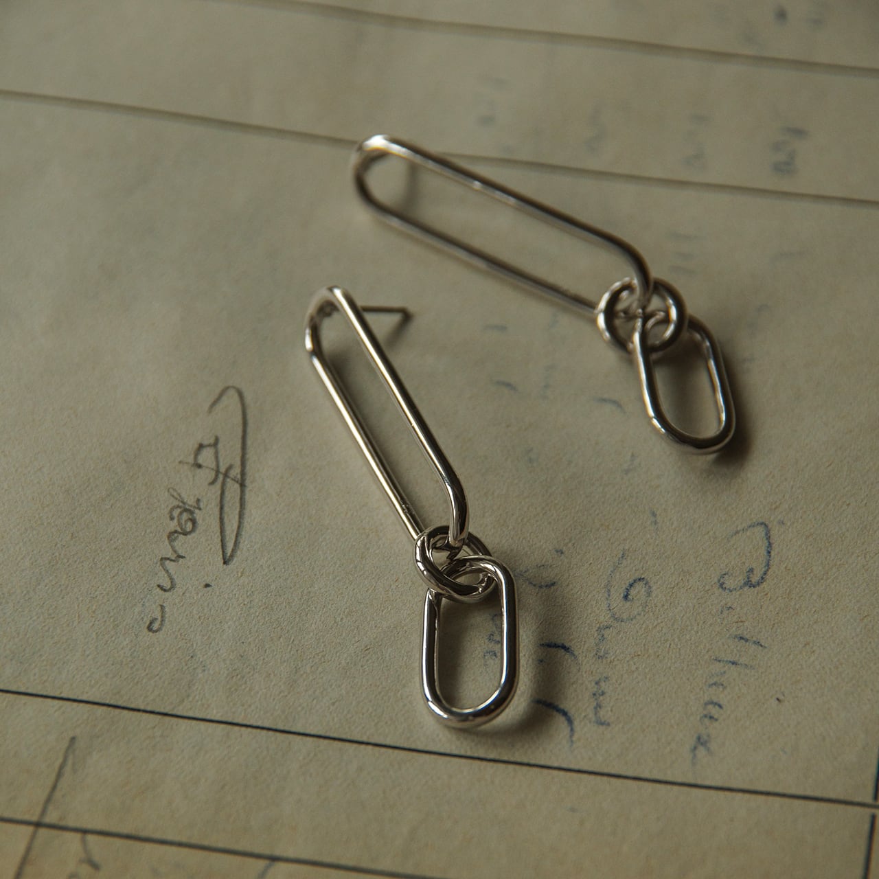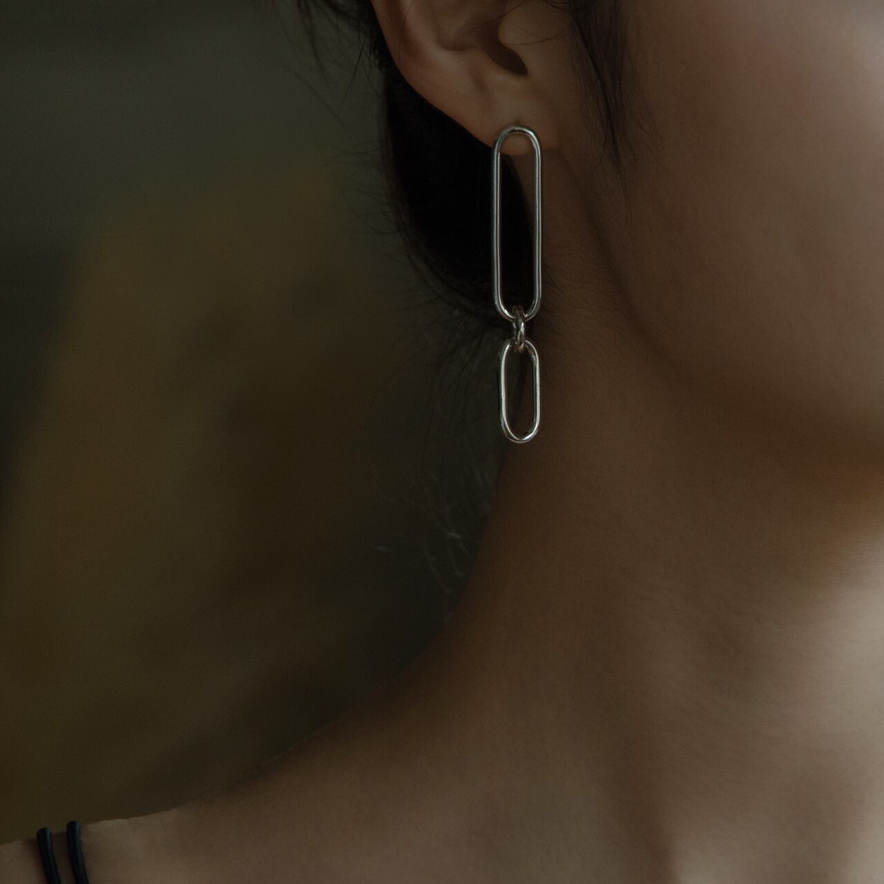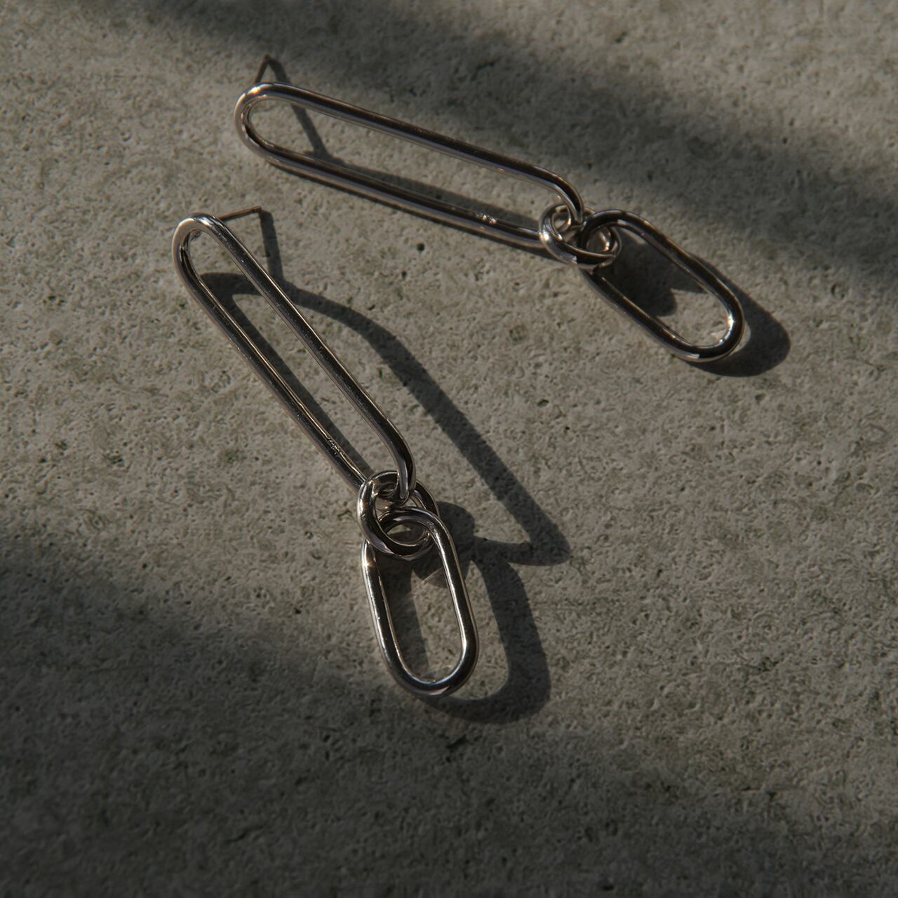 ロングシルエットのコネクトチェーンピアス。