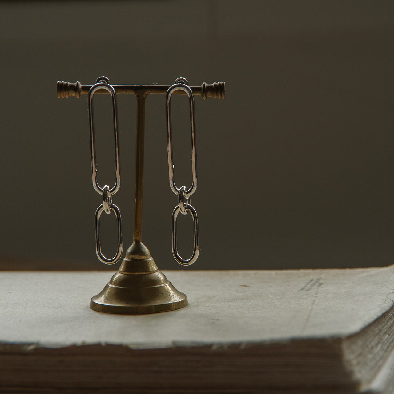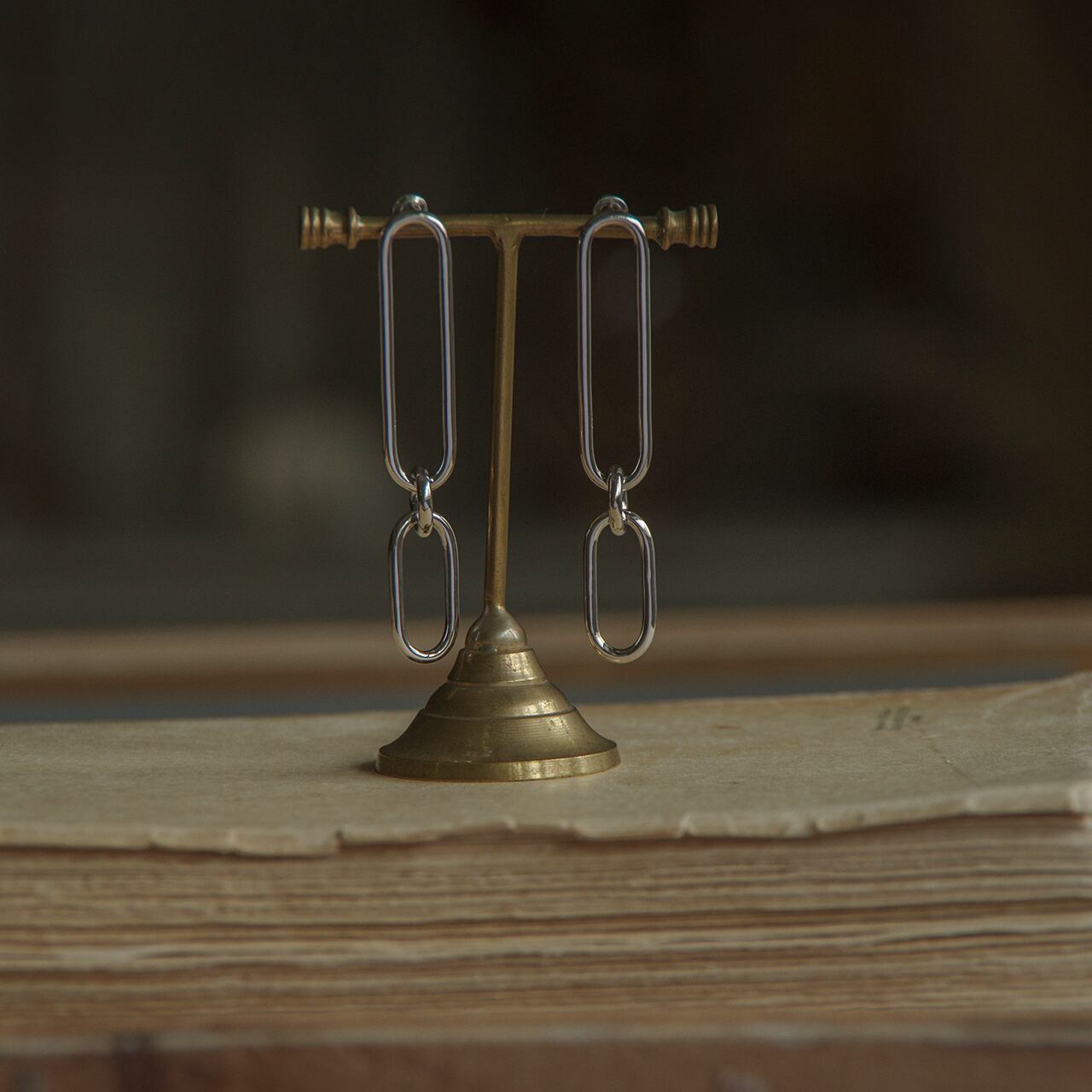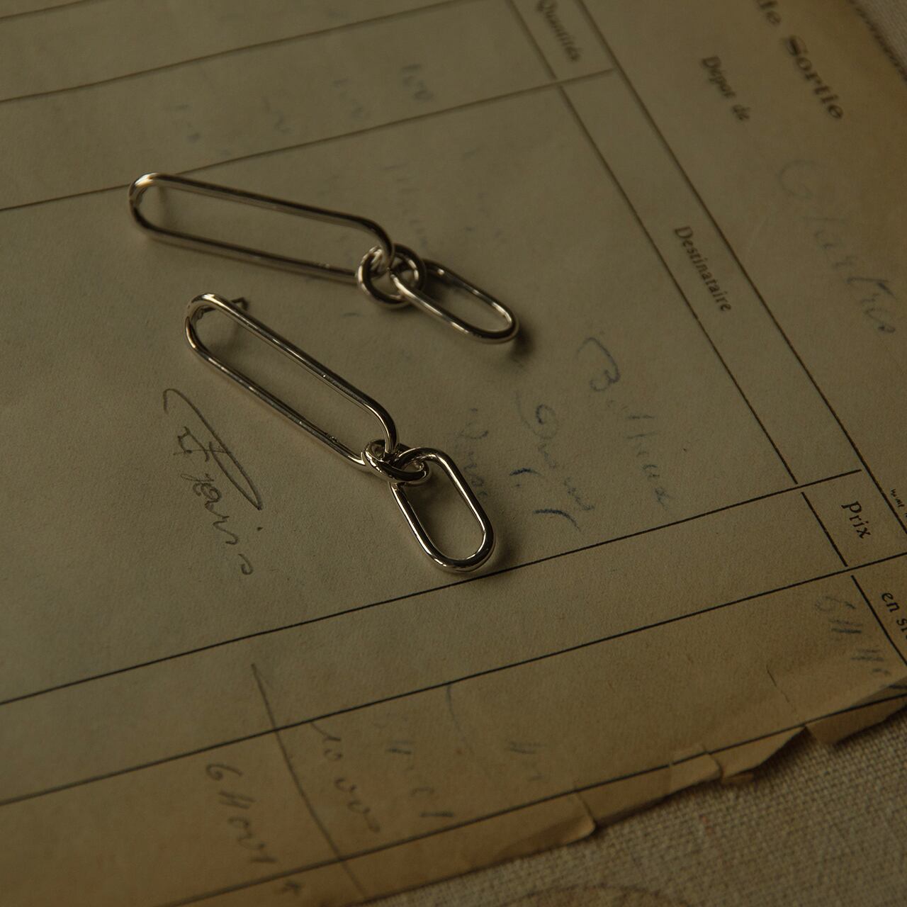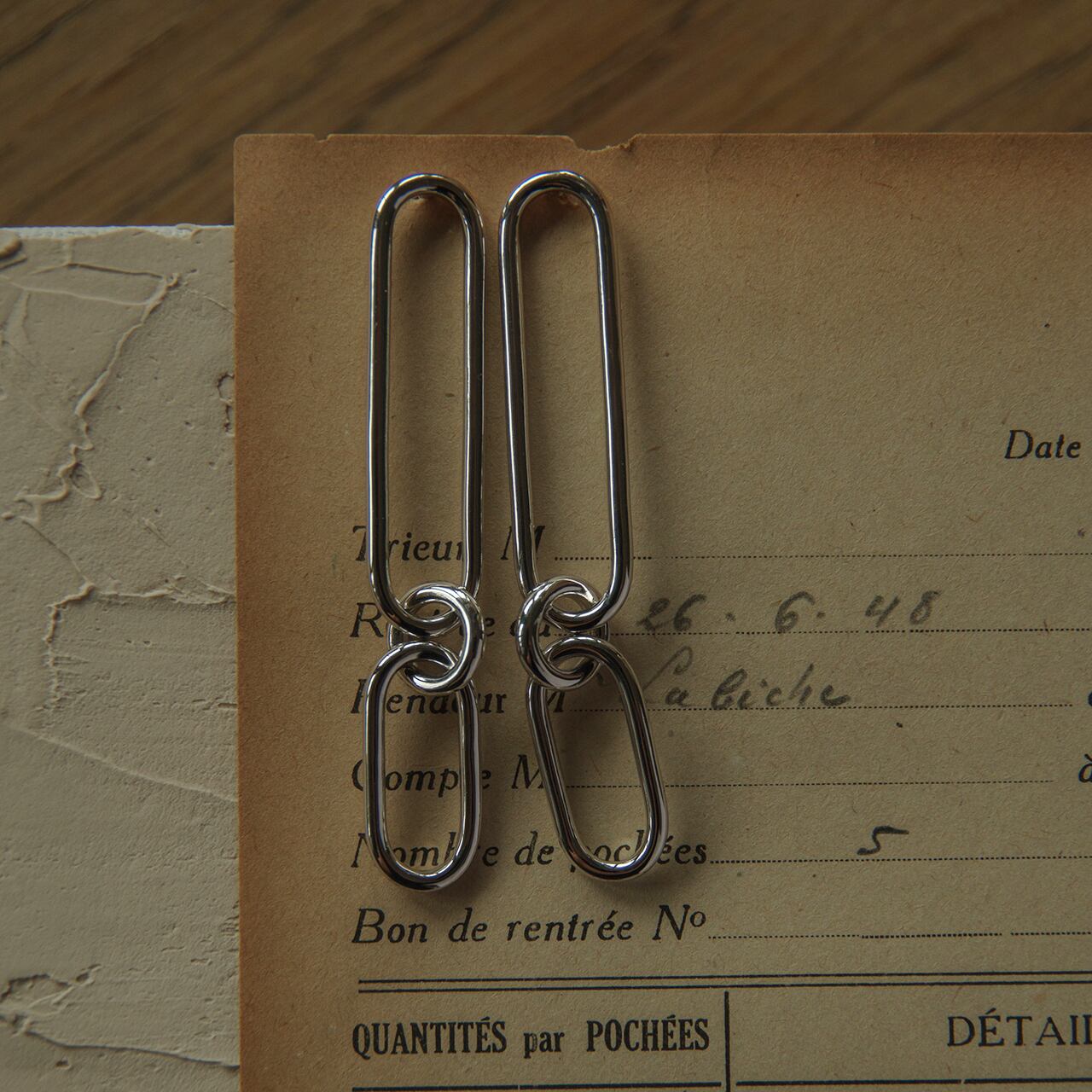 ロングシルエットのコネクトチェーンピアス。